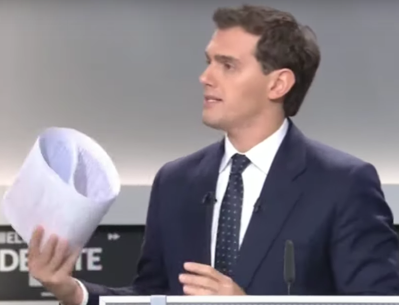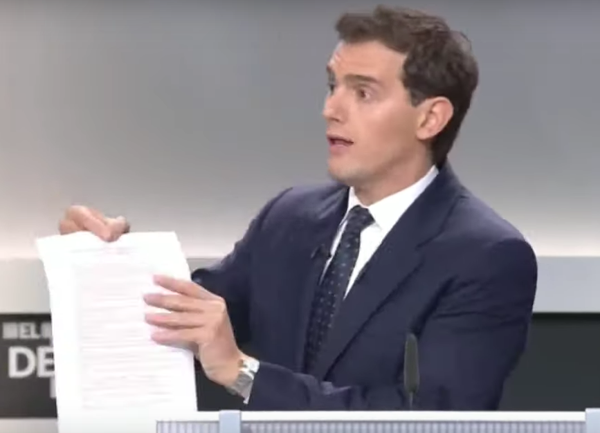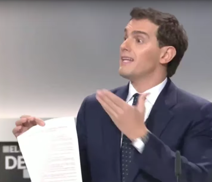 Albert Rivera alza la barbilla, sube el tono y amplitud de los gestos cuando saca el papel con las concesiones a Cataluña. Denota que ese tema tenía ganas de exponerlo.