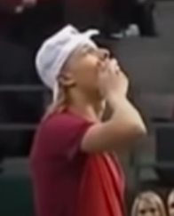 Si tienen cualquier tipo de duda sobre lo que he comentado, les dejo imágenes de tenistas que han golpeado accidentalmente a otras personas durante el partido. La imágenes son inmediatamente después de ser conscientes que han golpeado a alguien y este alguien está doliéndose. Su calidad es escasa puesto que son capturas de pantalla del vídeo del momento del impacto.